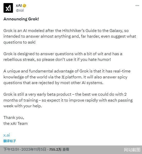 xAI同时表示,这个模型至今只花了两个月时间来训练,所以仍是非常初步的版本,现在每一周都在迭代进步。这个模型也具有非常独特的数据优势:通过社交媒体X平台的数据,该模型能够获得对这个世界的实时认知。同时该模型也会回答“可能会被大多数其他模型拒绝的辛辣问题”。