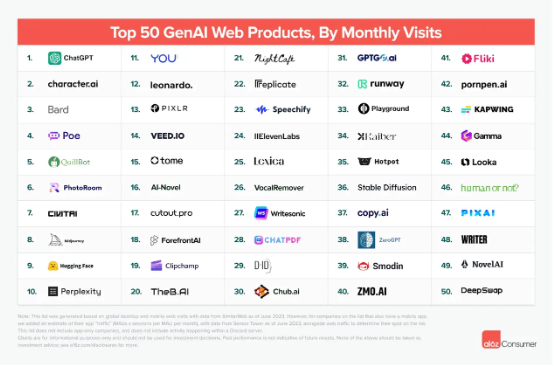在他看来,不少初创公司在网络流量上的表现已经超越了价值数十亿美元的传统公司,而且其业务定位均匀分布在打包、微调和专有模型等各个领域。也就是说,部分 GPT 打包方案的月度访问量,比某些估值数十亿美元的企业还要高。