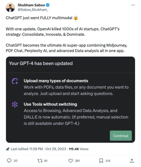 正如 Tenstorrent 公司人工智能总监 Shubham Saboo 评论的那样,“ChatGPT 的战略:巩固、创新和统治。ChatGPT 会成为终极 AI 超级应用程序,将 Midjourney、PDF Chat、Perplexity AI 和高级数据分析全部结合在一个应用程序中。”