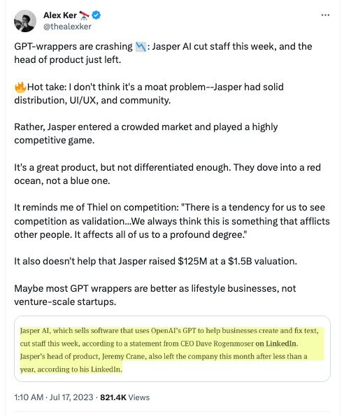 Jasper 以 $1.5B 估值筹集了 1.25 亿美元,这也无济于事。也许 GPT 打包模式并不适合初创公司。