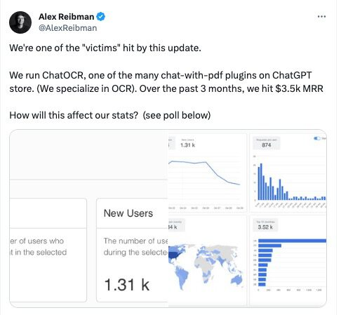 我们是本次更新的“受害者”之一。我们运行着 ChatOCR,ChatGPT 商店中众多 PDF 处理插件之一(我们主打的是 OCR)。过去 3 个月来,我们的月度经常性收入达到 3500 美元。大家认为,这次更新会对我们造成怎样的影响?